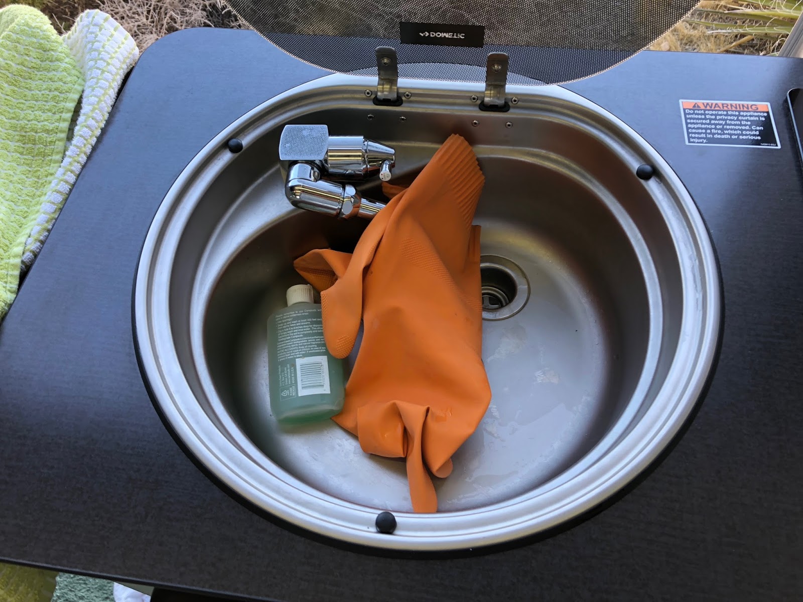 Our system for doing dishes: dirty on the right, clean on the left, and don’t forget your dish towels. Don’t really love the macerater pump, but it's a necessary evil, given the location of the refrigerator. Love the hot water, we never had that before in our beloved Eurovan Camper!