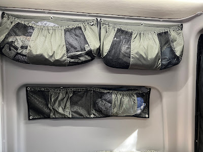We needed a bit more soft storage in the van for things like extra blankets, laundry, etc, so we got a couple of these bags (Fabric Stuff Bags 24 x 10 Deep) from RB Components. I thought about using expansion nuts to hang them, but the screws that RB shipped turned out to be just fine in the plastic walls of the Revel. They mostly clear the bed, but do get compressed/squeezed when the bed is raised all the way. The bags seems well-made and durable, with solid grommets at all the connection points.